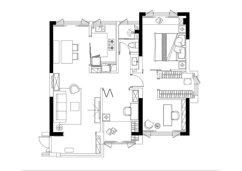 ▲卧室与书房之间,隔着一个黑色边框的玻璃隔断。