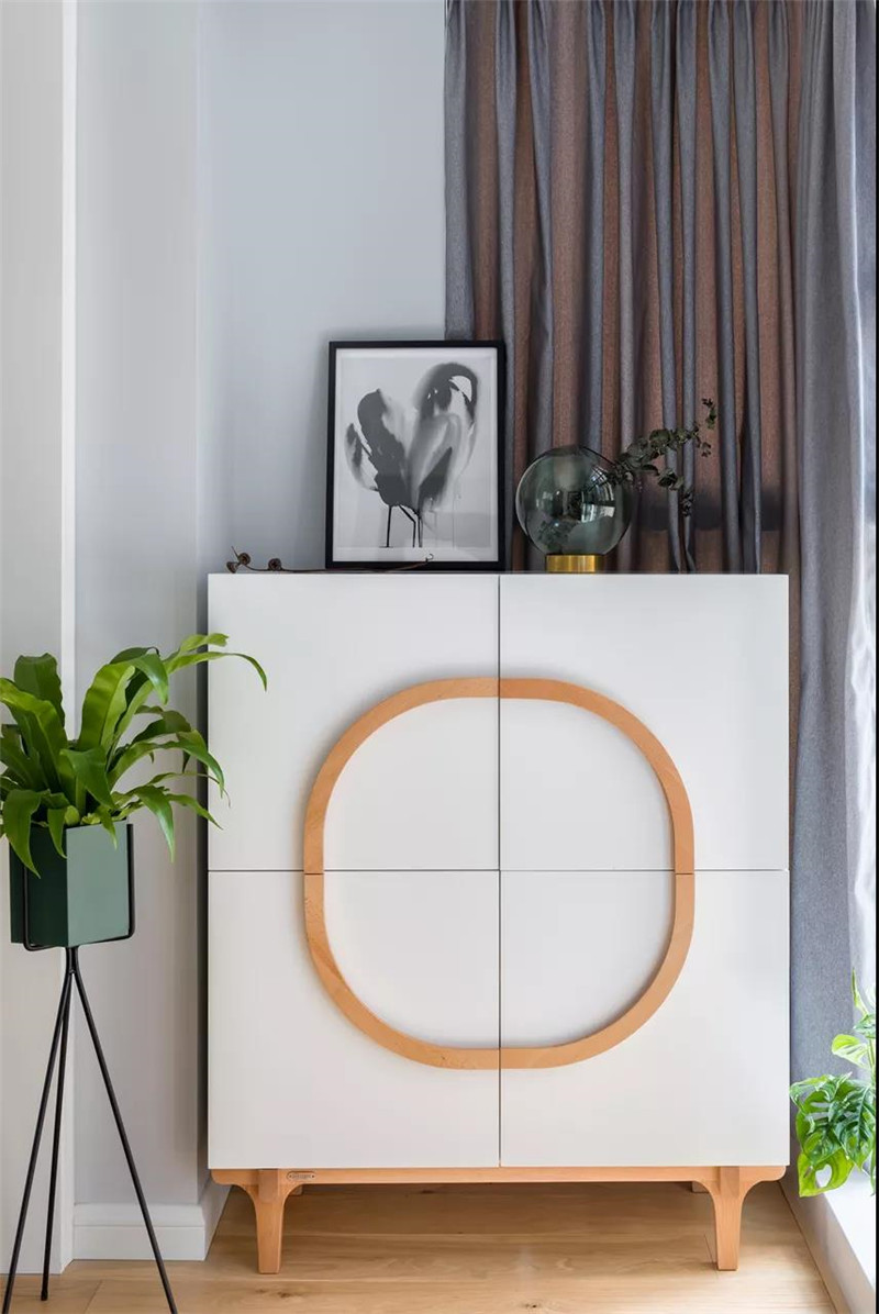 ▲玄关布置一个小鞋柜,木质柜体+白色门,柜门上还有一圈木质的装饰拉手,在旁边摆设了绿植,还有柜子台面上的装饰花瓶与黑白画,无处不在地体现了空间的自然清新气息。