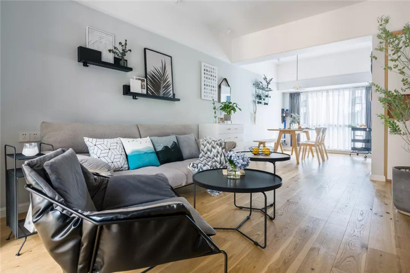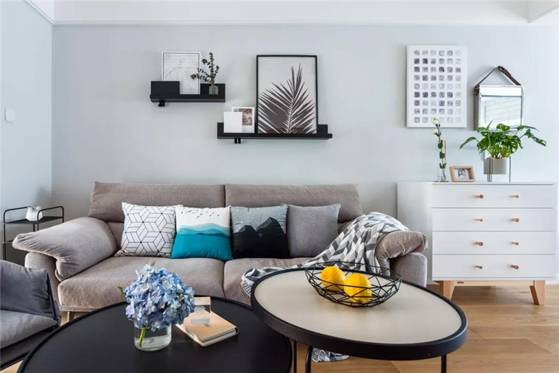 ▲在木地板的质感地面下,浅灰色的客厅墙面空间,布置上暖灰色沙发,再布置上几个精致舒适的抱枕,黑色的圆形茶几与皮艺单人沙发,营造出一种时尚端庄的年轻氛围感。