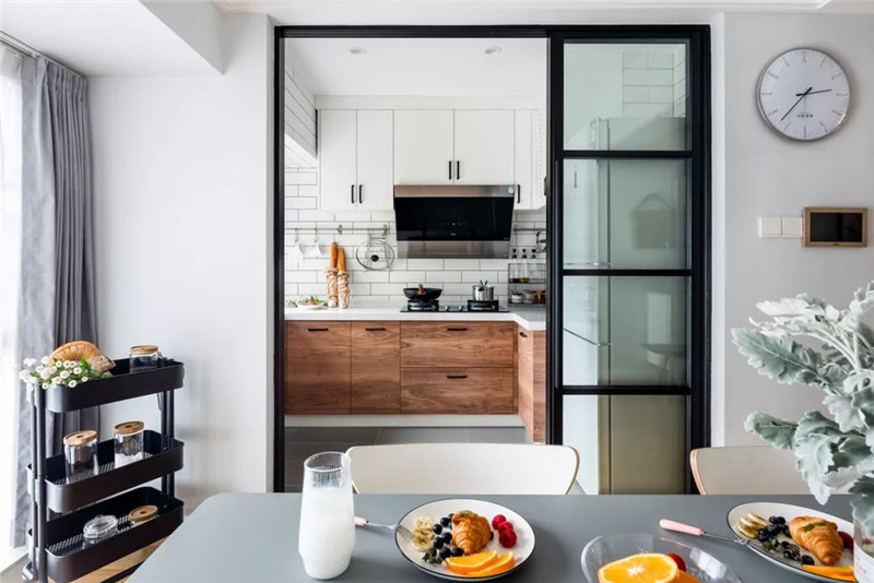 ▲在白色工字砖的墙面基础,装上一个木质的定制橱柜,让做饭炒菜空间也显得文艺轻松自然。