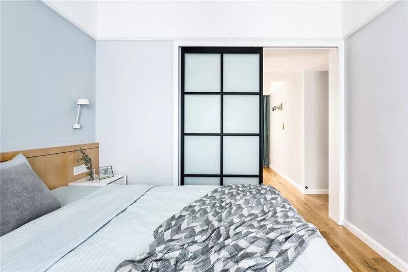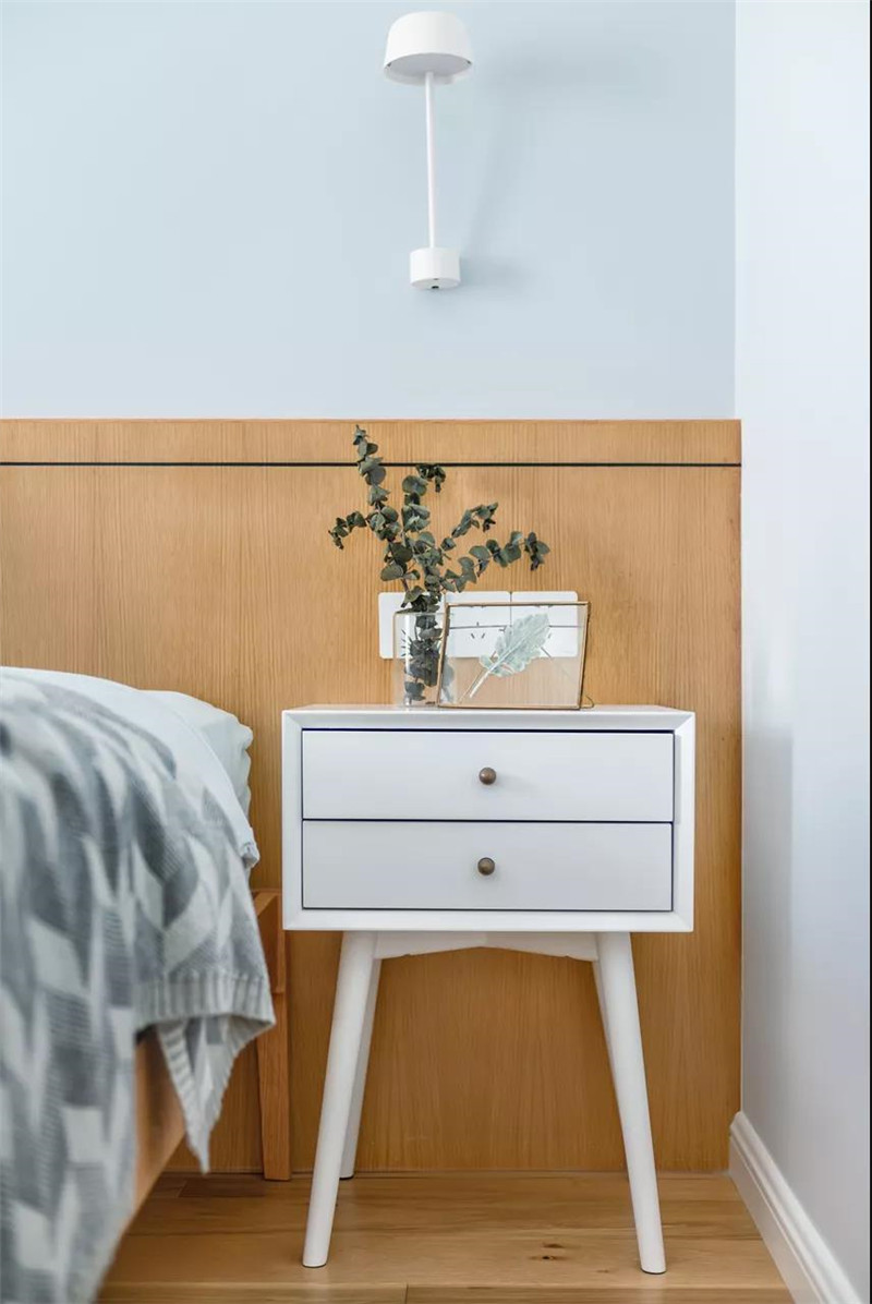 ▲卧室的床头墙墙脚区域装上护墙板,边上白色的床头柜设计,整体空间简约自然而清新。