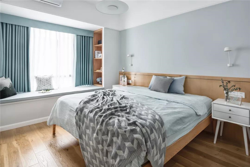 ▲淡灰色的墙面,还有灰蓝色的床单与窗帘,也增添了空间的简约视觉感。
