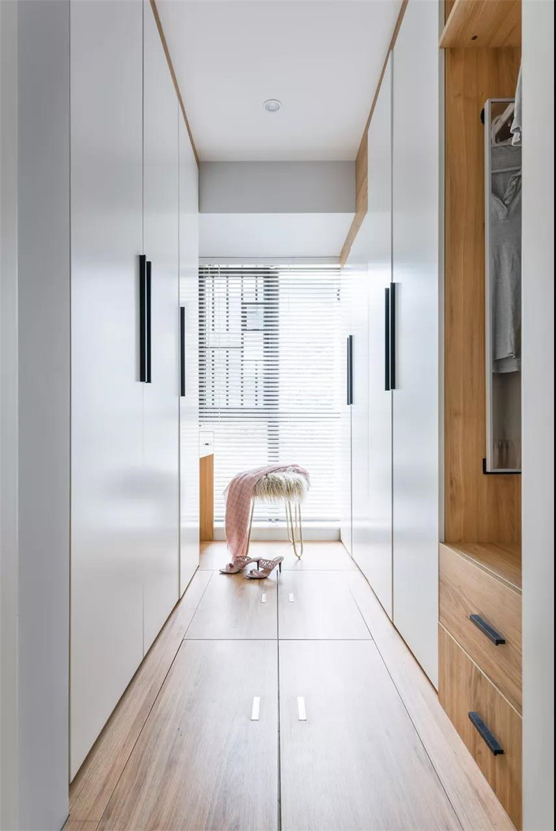 ▲步入式的衣帽间,整体地面抬高,把地面也是装成上开盖的收纳,两侧是衣柜,植入一个开放的挂衣区,靠窗还设置了一张梳妆台,整个空间虽小却也收纳强大。