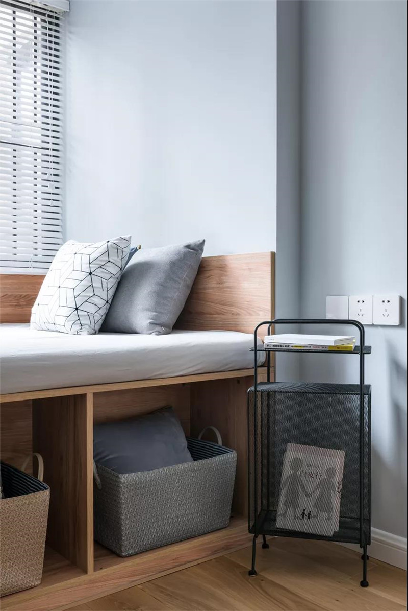 ▲飘窗的侧边装了开放的格架,摆放小饰品与书籍,偶尔闲暇之余就可以坐在上面看书放松了。