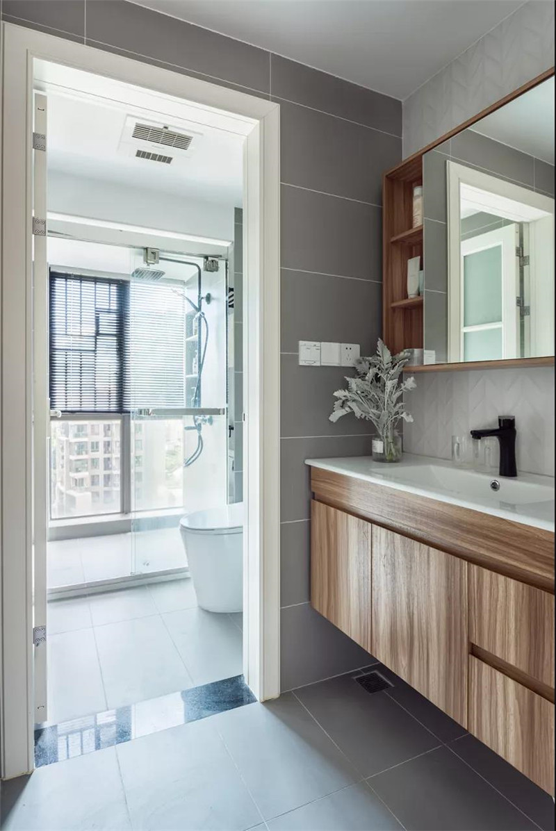 ▲卫生间把洗手盆外置过道区域,淋浴房旁边有着大面积的落地窗,装上百叶帘,白天这个空间会有这明亮的采光体验。